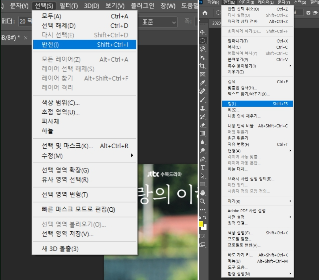 선택(Select) - 반전 (Inverse) 메뉴를 선택을 하고