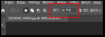 원형 선택 윤곽 도구 툴을 클릭 후 Feather(페더)의 값을 줍니다.
