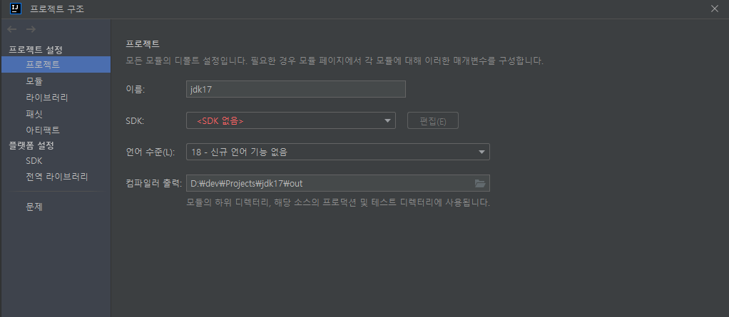 프로젝트 SDK 설정 화면